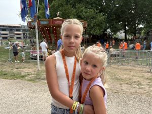 Tussen alle attracties door spotten we Anna (9) en Nore (4). Twee zusjes die stralen met prachtig versierd haar. Niet voor de eerste keer trouwens; ze weten precies waar ze moeten zijn voor zo’n kleurrijke coupe.